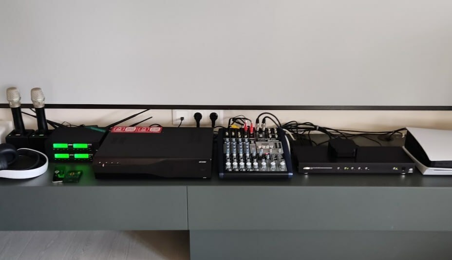 Для отображения текстов песен и создания атмосферы используется премиальный комплект Laser TV от Hisense (модель 120L9H) с ярким 4K-проектором и специальным ALR-экраном на 120 дюймов, который эффективно борется с внешней засветкой. Видеосигнал легко коммутируется через профессиональный коммутатор ATEN.