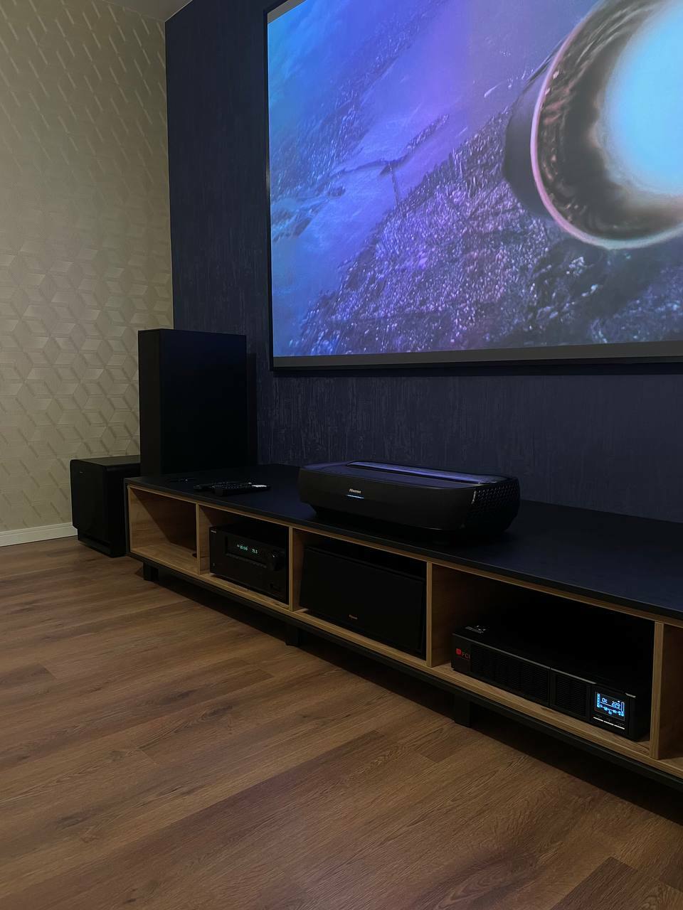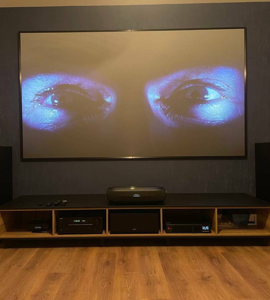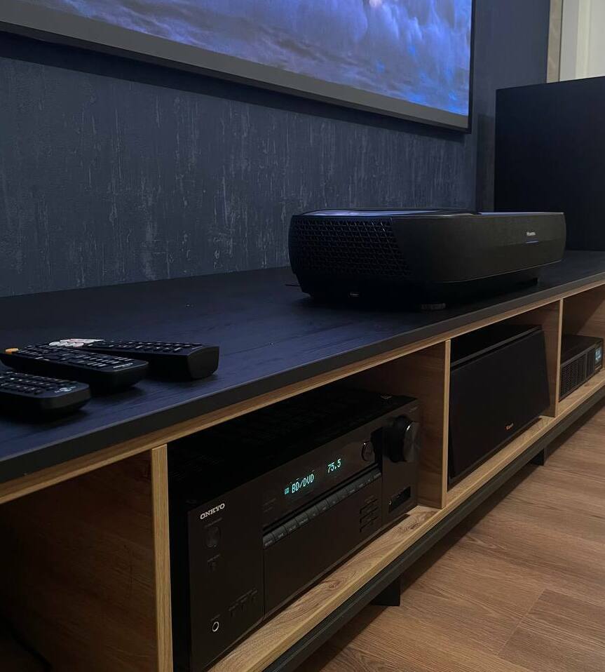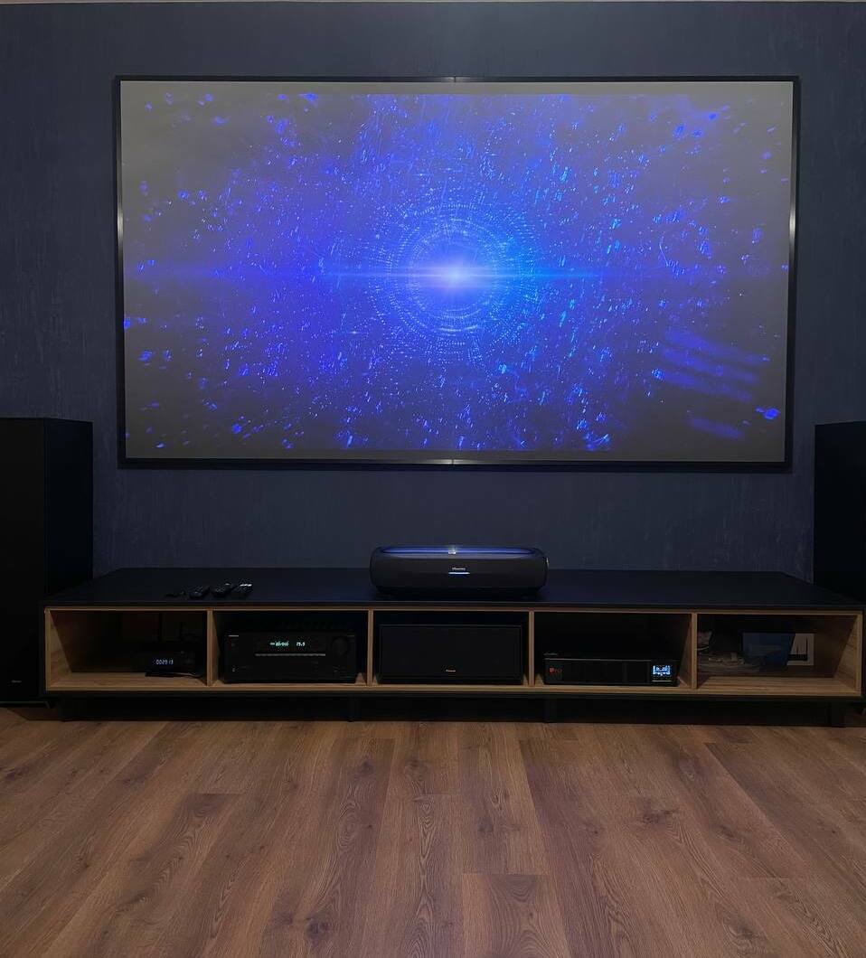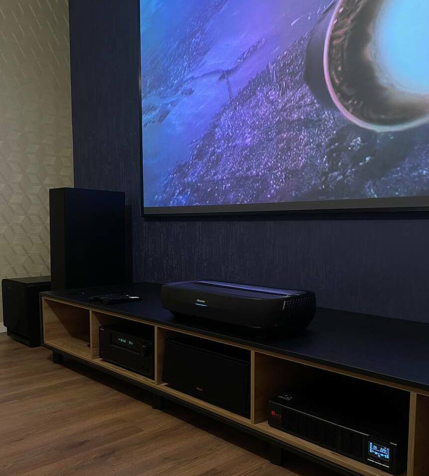 Мы реализовали комплексную инсталляцию, превратившее пространство частного дома в профессиональный кинозал. Сердцем системы стал революционный Hisense 120L9H — 120-дюймовый лазерный телевизор-кинотеатр, обеспечивающий невероятно яркое, контрастное и детализированное изображение без необходимости в отдельном проекторе.