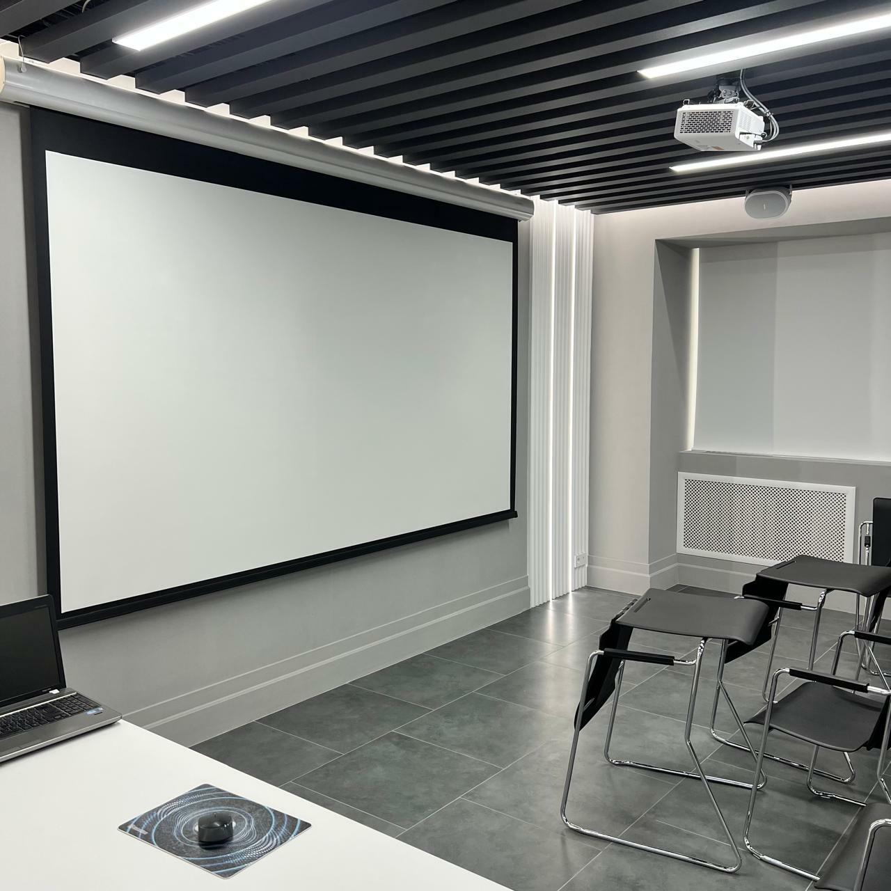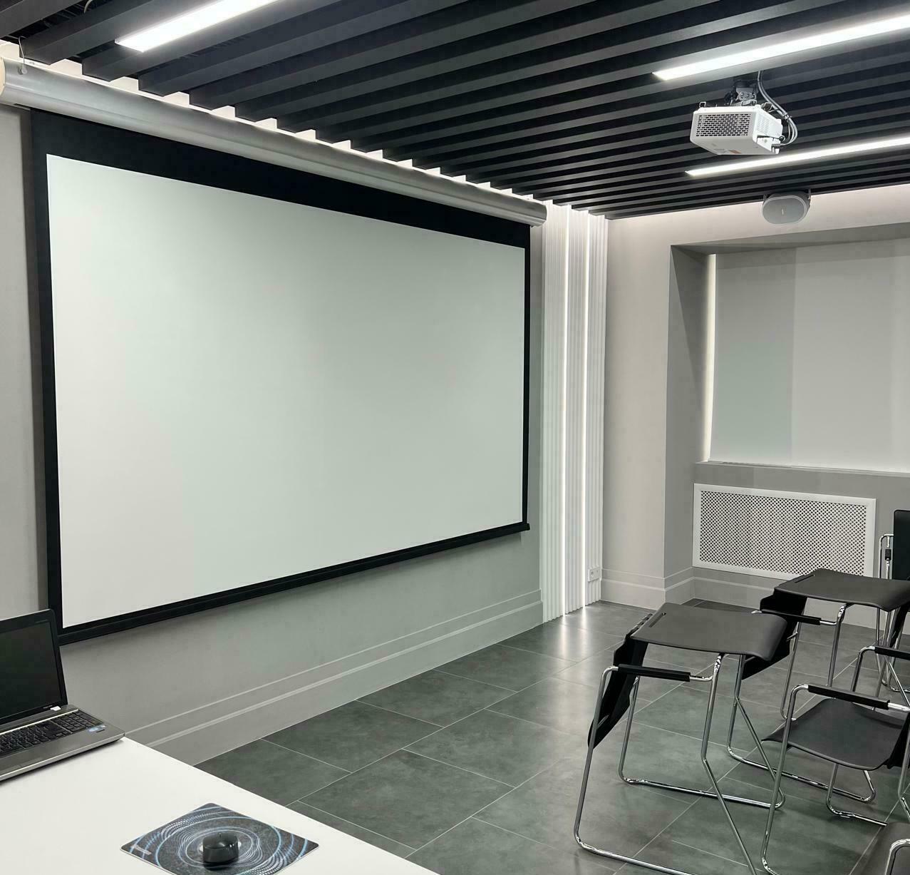 Система 7.1 с проектором и стационарным экраном, в гостиной квартиры. Великолепное воспроизведение кино, музыки, игр, спутникового телевещания. Настоящий развлекательный комплекс в одном помещении.