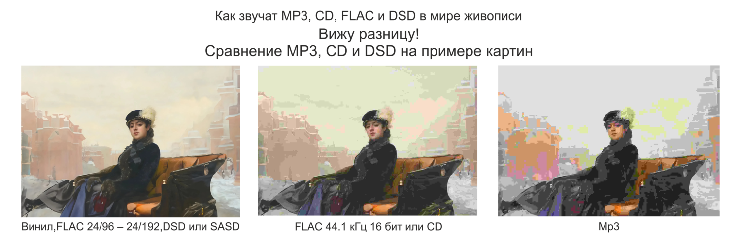 - Вы узнаете сюжет и основные цвета, но детали размыты, контуры грубые, а цветовые переходы видны как ступенчатые полосы. Именно так MP3 «отрезает» часть музыкальной информации для экономии места. Вы слышите мелодию, но теряете текстуры, воздух вокруг инструментов и тонкие нюансы.